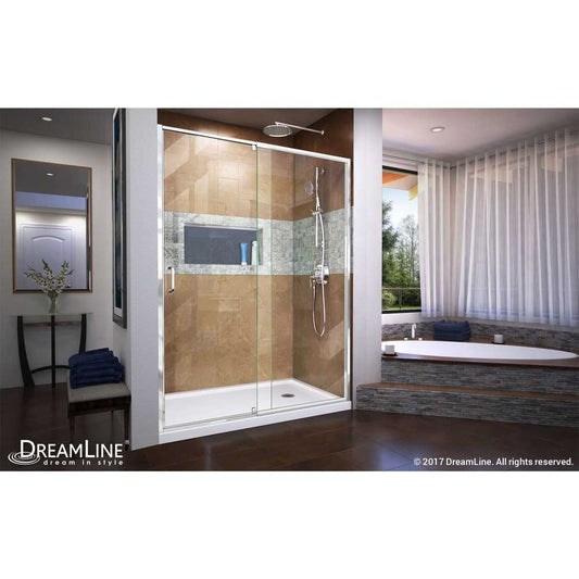 Flex 34 in. D x 60 in. W x 76 3/4 in. H Semi-Frameless Shower Door in Chrome with Center Drain White Base and Backwalls