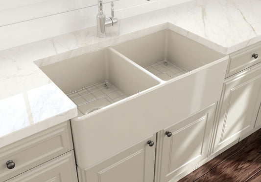 Classico Farmhouse Apron Front Fireclay 33" Double Bowl Kitchen Sink in Biscuit