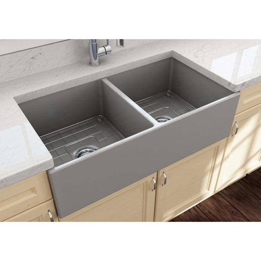 Contempo Apron Front Fireclay 36 in. Double Bowl Kitchen Sink with Protective Bottom Grids and Strainers in Matte Gray