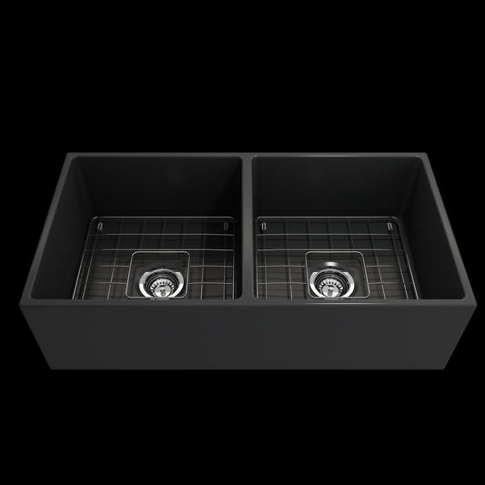 Contempo Apron Front Fireclay 36 in. Double Bowl Kitchen Sink with Protective Bottom Grids and Strainers in Matte Dark Gray