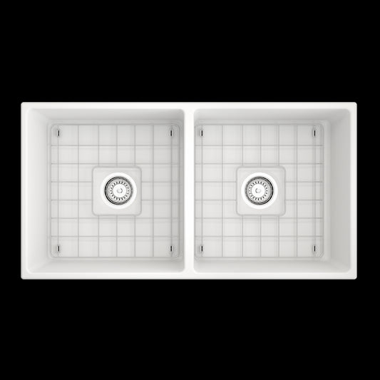 Contempo Apron Front Fireclay 36 in. Double Bowl Kitchen Sink with Protective Bottom Grids and Strainers in Matte White