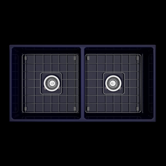 Contempo Apron Front Fireclay 36 in. Double Bowl Kitchen Sink with Protective Bottom Grids and Strainers in Sapphire Blue