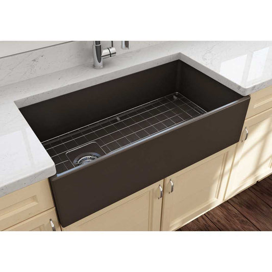 Contempo Apron Front Fireclay 36 in. Single Bowl Kitchen Sink with Protective Bottom Grid and Strainer in Matte Brown