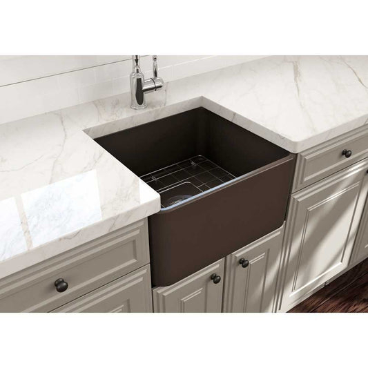 Farmhouse Apron Front Fireclay 20 in. Single Bowl Kitchen Sink with Protective Bottom Grid and Strainer in Matte Brown