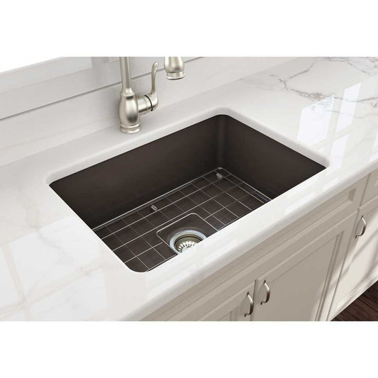 Sotto Undermount Fireclay 27 in. Single Bowl Kitchen Sink with Protective Bottom Grid and Strainer in Matte Brown