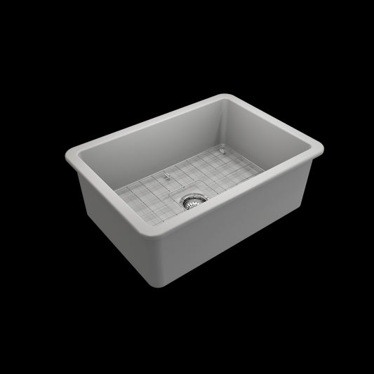 Sotto Undermount Fireclay 27 in. Single Bowl Kitchen Sink with Protective Bottom Grid and Strainer in Matte Gray