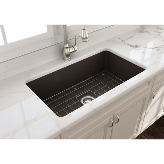 Sotto Undermount Fireclay 32 in. Single Bowl Kitchen Sink with Protective Bottom Grid and Strainer in Matte Brown