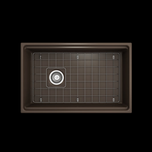 Apron Front Step Rim with Integrated Work Station Fireclay 30 in. Single Bowl Kitchen Sink with Accessories in Matte Brown