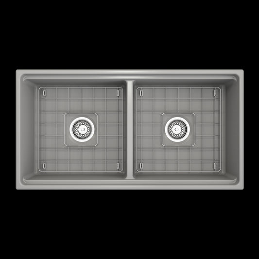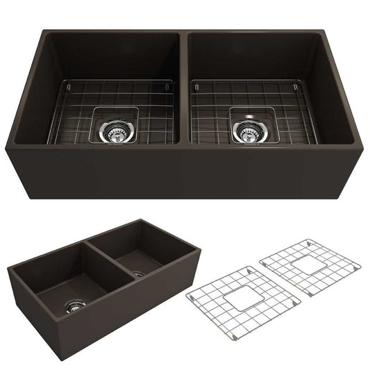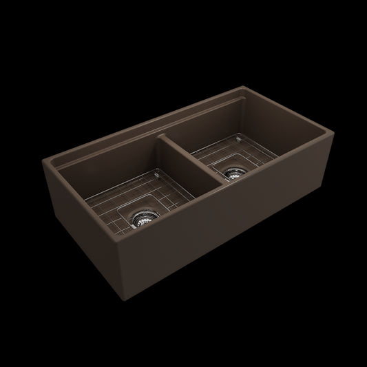 Contempo Apron Front Fireclay 36 in. Double Bowl Kitchen Sink with Protective Bottom Grids and Strainers in Matte Brown