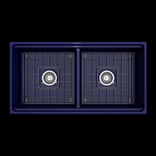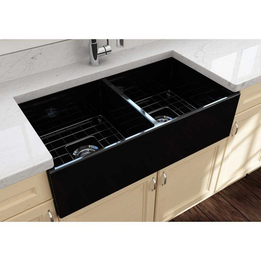 Contempo Apron Front Fireclay 36 in. Double Bowl Kitchen Sink with Protective Bottom Grids and Strainers in Black