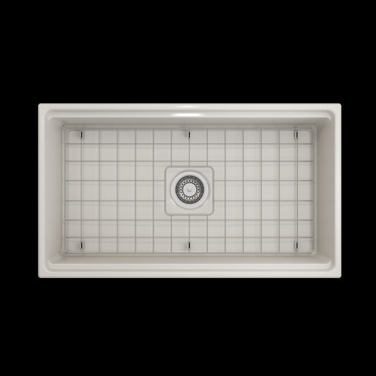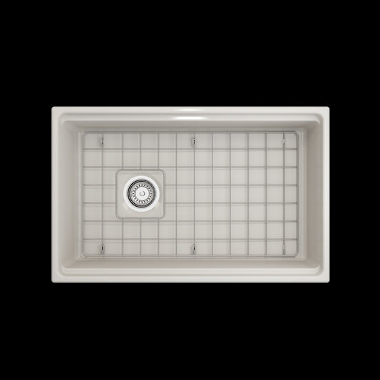 Apron Front Step Rim with Integrated Work Station Fireclay 33 in. Single Bowl Kitchen Sink with Accessories in Biscuit
