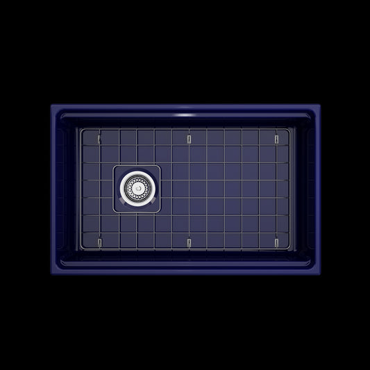 Apron Front Step Rim with Integrated Work Station Fireclay 30 in. Single Bowl Kitchen Sink with Accessories in Sapphire Blue