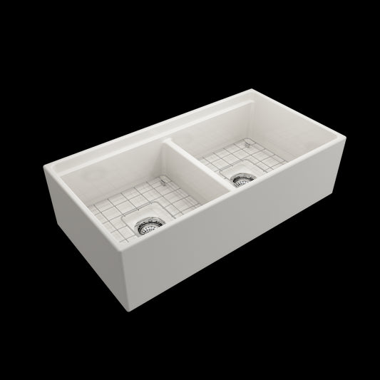 Apron Front Step Rim with Integrated Work Station Fireclay 36 in. Double Bowl Kitchen Sink with Accessories in Biscuit