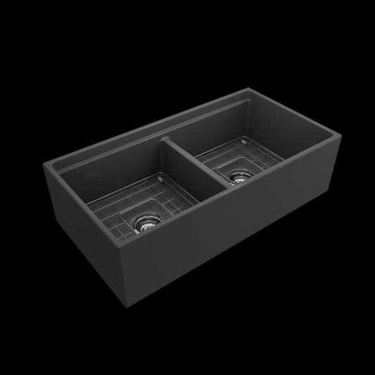 Apron Front Step Rim with Integrated Work Station Fireclay 36 in. Double Bowl Kitchen Sink with Accessories in Matte Dark Gray
