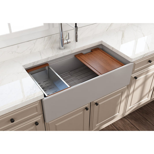 Apron Front Step Rim with Integrated Work Station Fireclay 36 in. Single Bowl Kitchen Sink with Accessories in Matte Gray