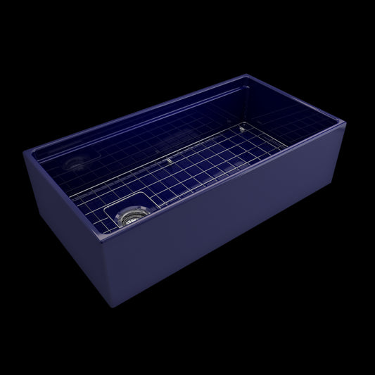 Apron Front Step Rim with Integrated Work Station Fireclay 36 in. Single Bowl Kitchen Sink with Accessories in Sapphire Blue