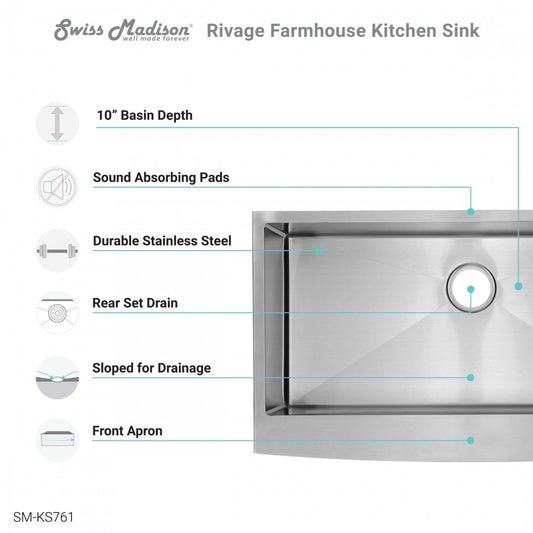 Rivage 33 x 21 Stainless Steel, Single Basin, Farmhouse Kitchen Sink with Apron