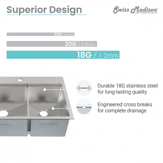 Ouvert 33 x 22 Stainless Steel, Dual Basin, Top-Mount Kitchen Sink