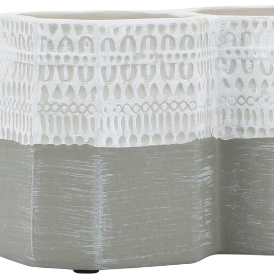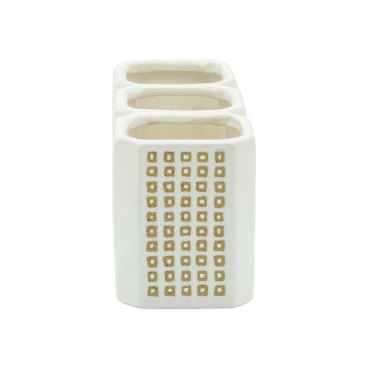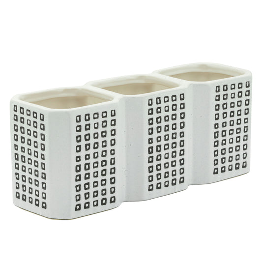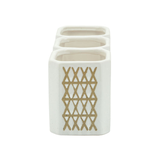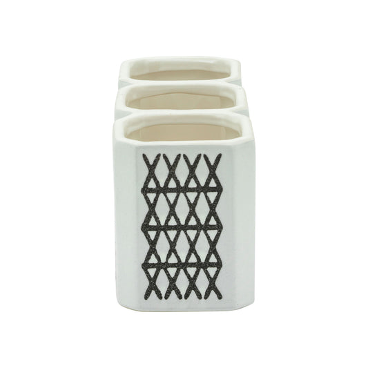 Cer, 4"h 3-cup Aztec Pen Holder, White/gray