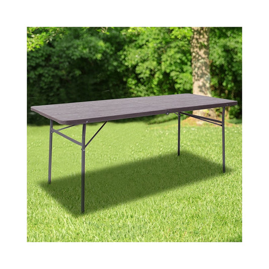 6-Foot Bi-Fold Brown Wood Grain Plastic Folding Table with Carrying Handle