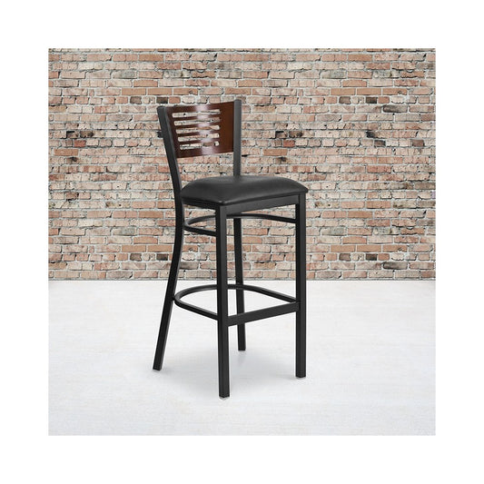 Black Slat Back Metal Restaurant Barstool - Walnut Wood Back, Black Vinyl Seat
