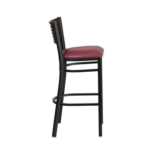 Black Slat Back Metal Restaurant Barstool - Walnut Wood Back, Burgundy Vinyl Seat