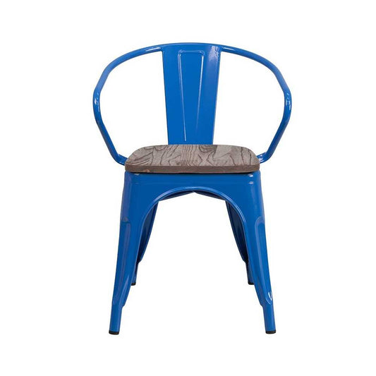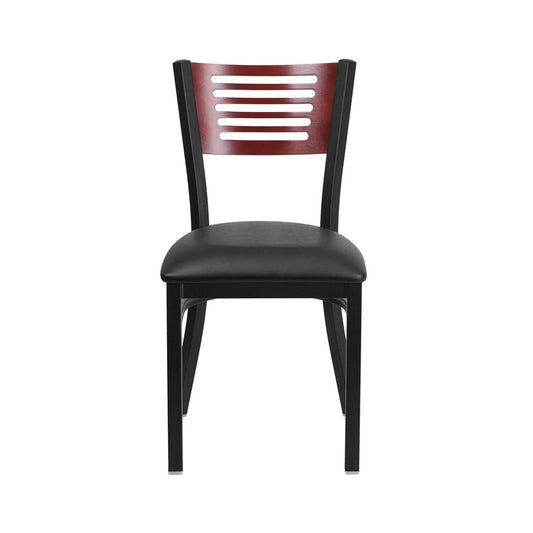 Black Slat Back Metal Restaurant Chair - Mahogany Wood Back, Black Vinyl Seat