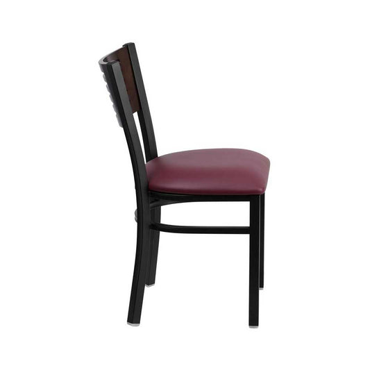 Black Slat Back Metal Restaurant Chair - Walnut Wood Back, Burgundy Vinyl Seat