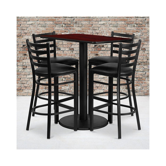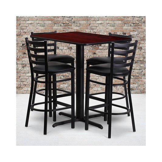 24''W x 42''L Rectangular Mahogany Laminate Table Set with 4 Ladder Back Metal Barstools - Black Vinyl Seat