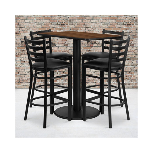 24'' x 42'' Rectangular Walnut Laminate Table Set with 4 Ladder Back Metal Barstools - Black Vinyl Seat