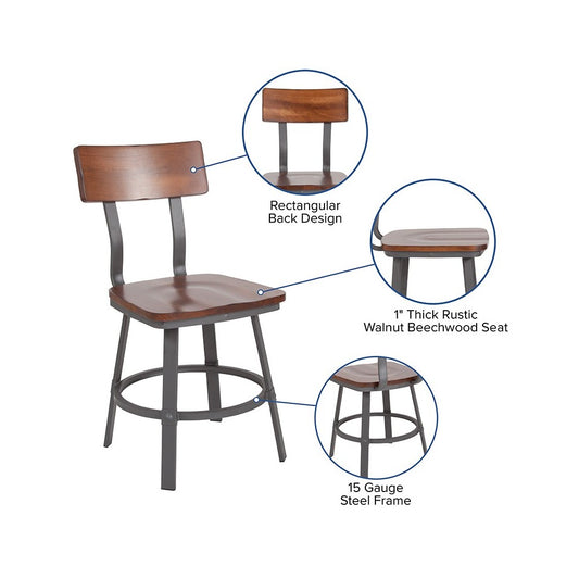 Flint Series Rustic Walnut Restaurant Chair with Wood Seat & Back and Gray Powder Coat Frame