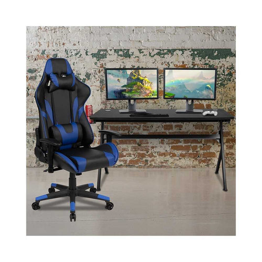 Gaming Desk and Blue/Black Reclining Gaming Chair Set /Cup Holder/Headphone Hook/Removable Mouse Pad Top - Wire Management