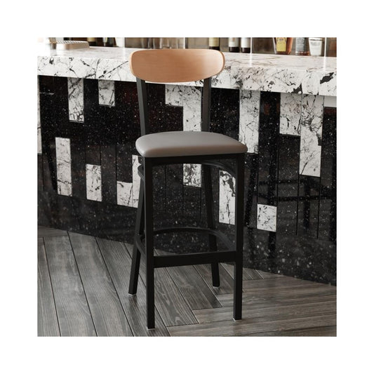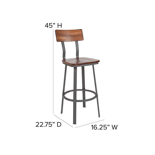 Flint Series Rustic Walnut Restaurant Barstool with Wood Seat & Back and Gray Powder Coat Frame