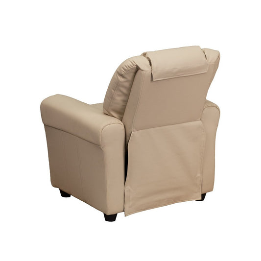 Contemporary Beige Vinyl Kids Recliner with Cup Holder and Headrest