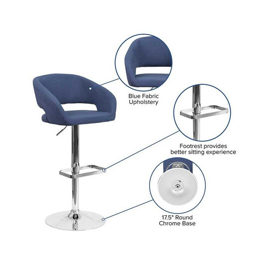 Contemporary Blue Fabric Adjustable Height Barstool with Rounded Mid-Back and Chrome Base