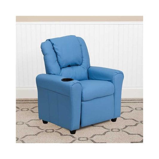 Contemporary Light Blue Vinyl Kids Recliner with Cup Holder and Headrest