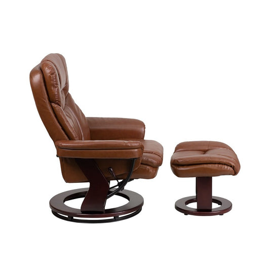 Contemporary Multi-Position Recliner and Curved Ottoman with Swivel Mahogany Wood Base in Brown Vintage LeatherSoft
