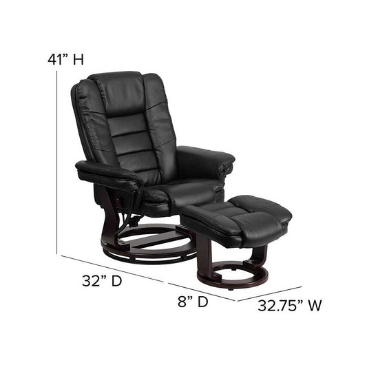 Contemporary Multi-Position Recliner with Horizontal Stitching and Ottoman with Swivel Mahogany Wood Base in Black LeatherSoft