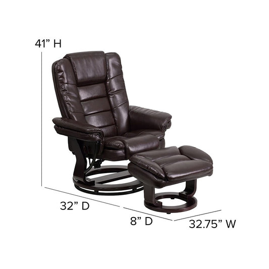 Contemporary Multi-Position Recliner with Horizontal Stitching and Ottoman with Swivel Mahogany Wood Base in Brown LeatherSoft