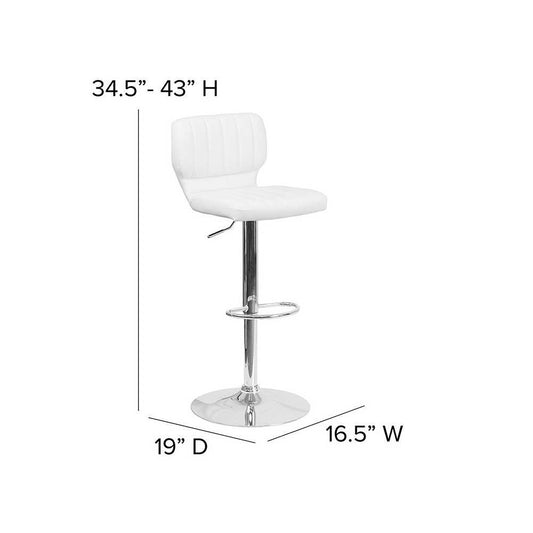 Contemporary White Vinyl Adjustable Height Barstool with Vertical Stitch Back and Chrome Base