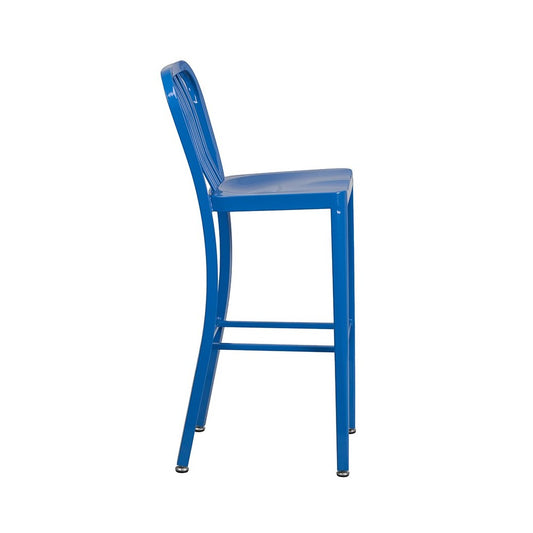 Commercial Grade 30" High Blue Metal Indoor-Outdoor Barstool with Vertical Slat Back