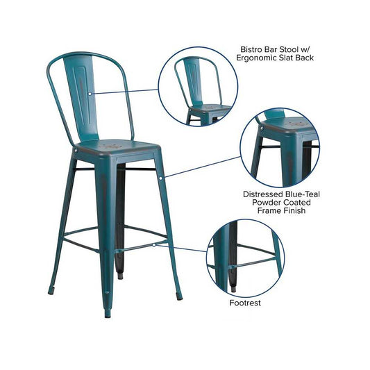 Commercial Grade 30" High Distressed Kelly Blue-Teal Metal Indoor-Outdoor Barstool with Back