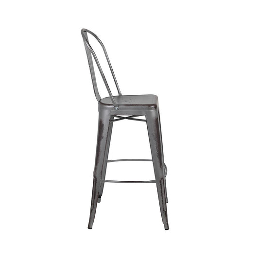 Commercial Grade 30" High Distressed Silver Gray Metal Indoor-Outdoor Barstool with Back