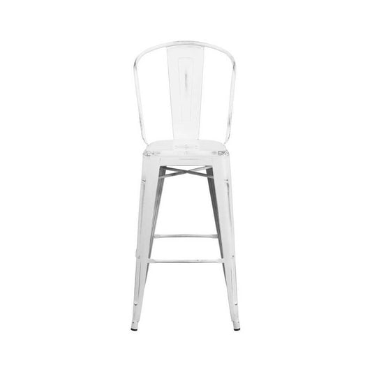 Commercial Grade 30" High Distressed White Metal Indoor-Outdoor Barstool with Back