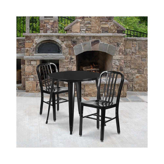 Commercial Grade 30" Round Black Metal Indoor-Outdoor Table Set with 2 Vertical Slat Back Chairs