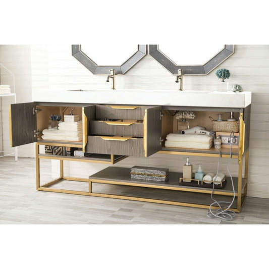 Columbia 72" Double Vanity, Ash Gray, Radiant Gold w/ Glossy White Composite Top