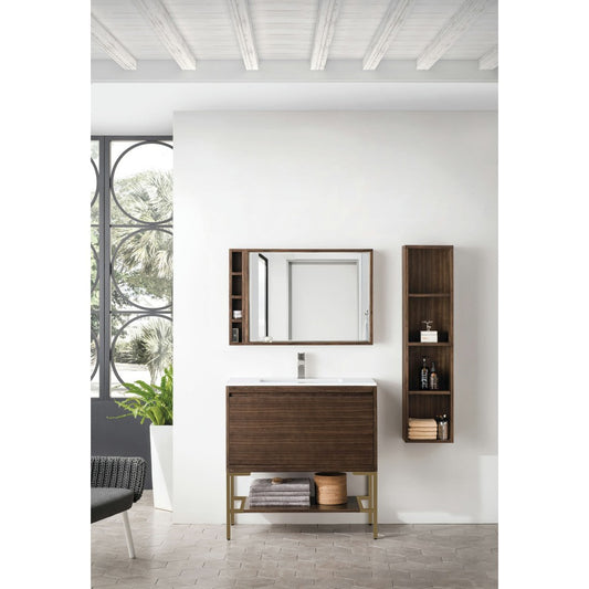 Milan 35.4" Single Vanity Mid Century Walnut Radiant Gold w/ White Composite Top