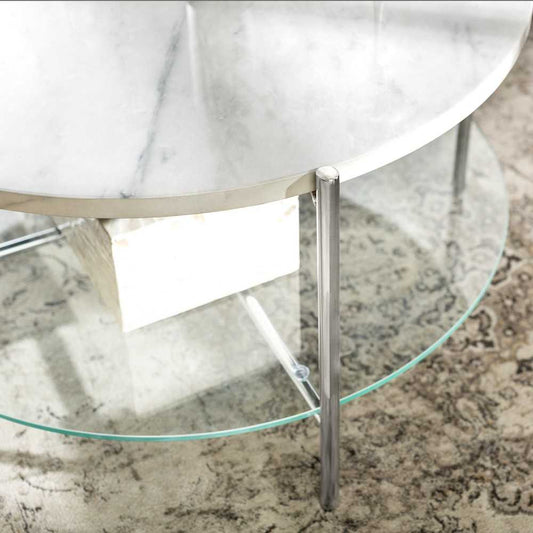 Simone Modern Round Coffee Table - Faux White Marble/Glass/Chrome