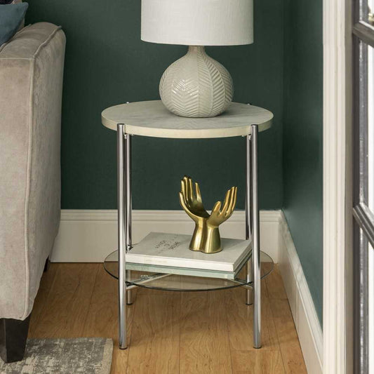 Simone Modern Round Side Table - Faux White Marble/Glass/Chrome