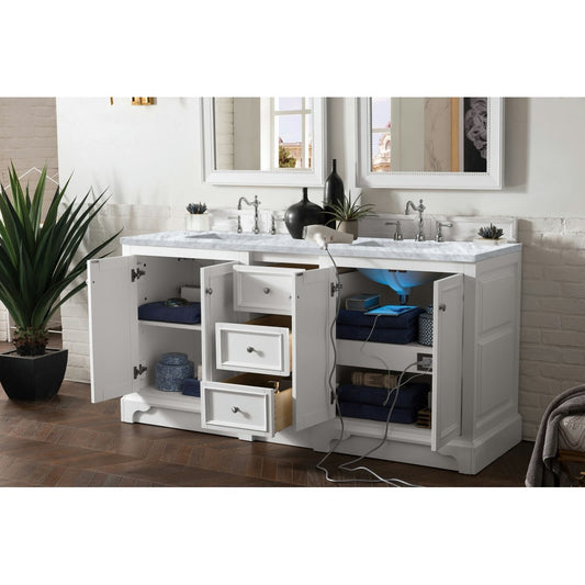 De Soto 72" Double Vanity, Bright White w/ 3 CM Carrara Marble Top